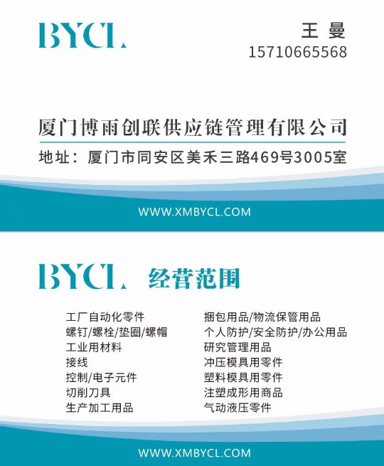 廈門博雨創(chuàng)聯(lián)供應(yīng)鏈管理有限公司是一家工業(yè)耗材專業(yè)供應(yīng)商,主要用于工業(yè)領(lǐng)域的輔助材料、具有適用面廣、使用量大且重復(fù)使用等特性,包括工廠自動(dòng)化零件,捆包用品、物流用品、五金工具,沖壓注塑模具零件、接線切削工具、氣動(dòng)液壓零件、個(gè)人防護(hù)安全防護(hù)及辦公用品等;公司宗旨為工業(yè)耗材領(lǐng)域工廠的生產(chǎn)、經(jīng)營(yíng)、管理提供一站式系統(tǒng)采購解決方案。